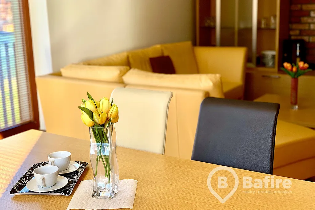 Jedná se o velice dobře řešený byt, který má 2 samostatné ložnice a obývací pokoj s plně vybaveným kuchyňským koutem. V koupelně, která je přístupná z chodby, se nachází vana se skleněnou zástěnou, umyvadlo včetně zrcadla s osvětlením a také pračka. WC je samostatně. Byt rovněž disponuje velkým množstvím úložného prostoru, jako jsou věstavěné skříně či komody. Byt se pronajímá plně vybavený tak, jak je možné vidět na fotografiích.