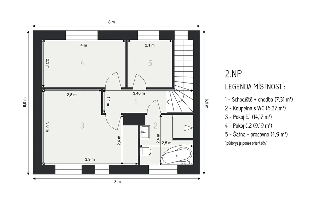 koupelna s WC: 6,37 m² (vana i sprchový kout)