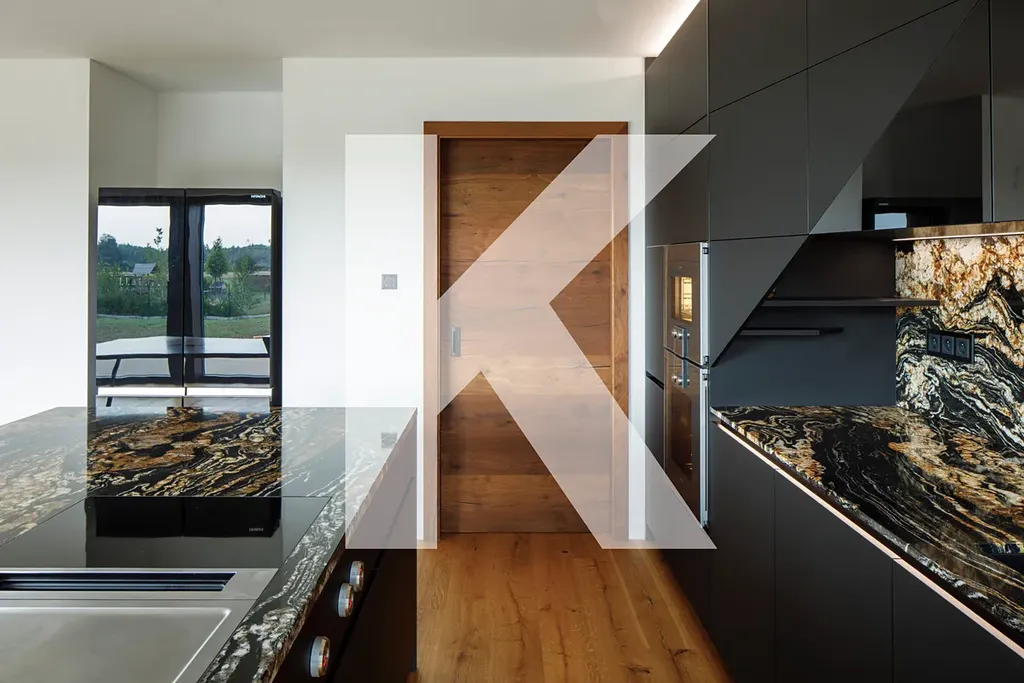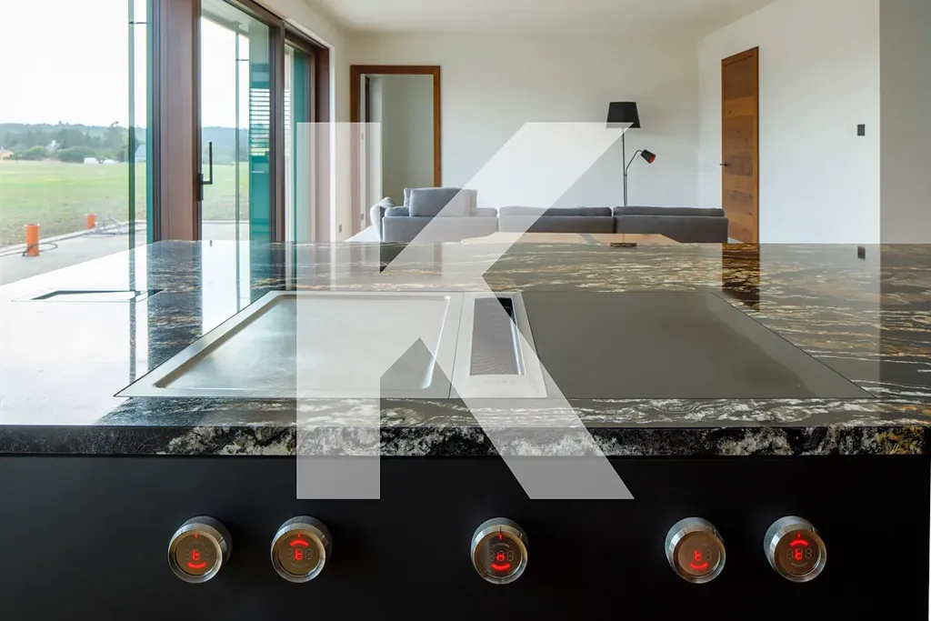 • designová kuchyňská linka se žulovou pracovní deskou, jídelním stolem z masivního dřeva a vestavěnými spotřebiči BORA a Miele, včetně: