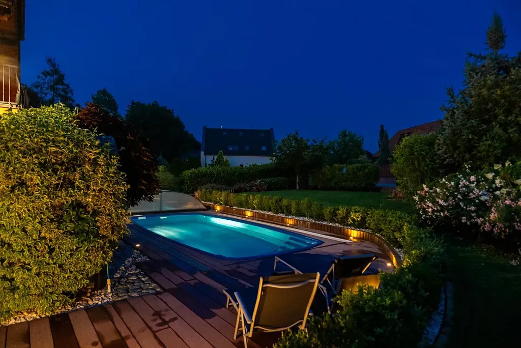 Krytý venkovní bazén je se slanou vodou a velmi silným protiproudem, ve kterém se dá plavat. O udržovaný trávník se stará robotická sekačka a automatický závlahový systém s retenční nádrží.
