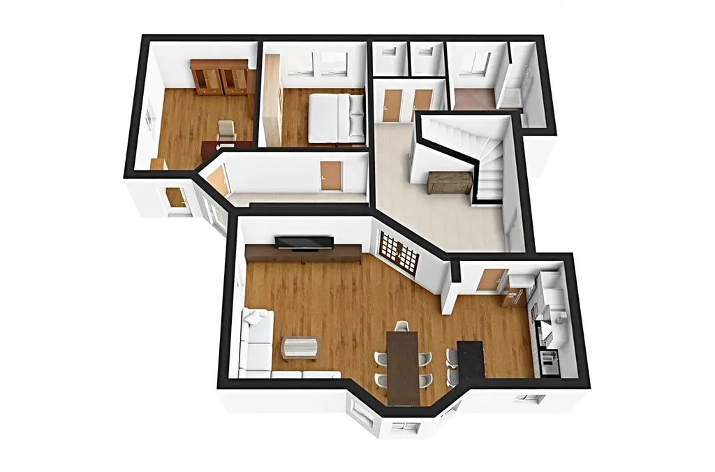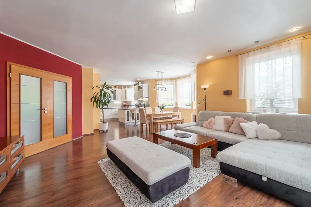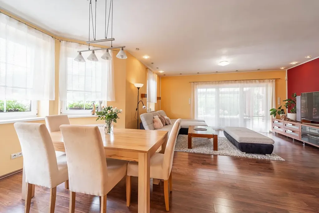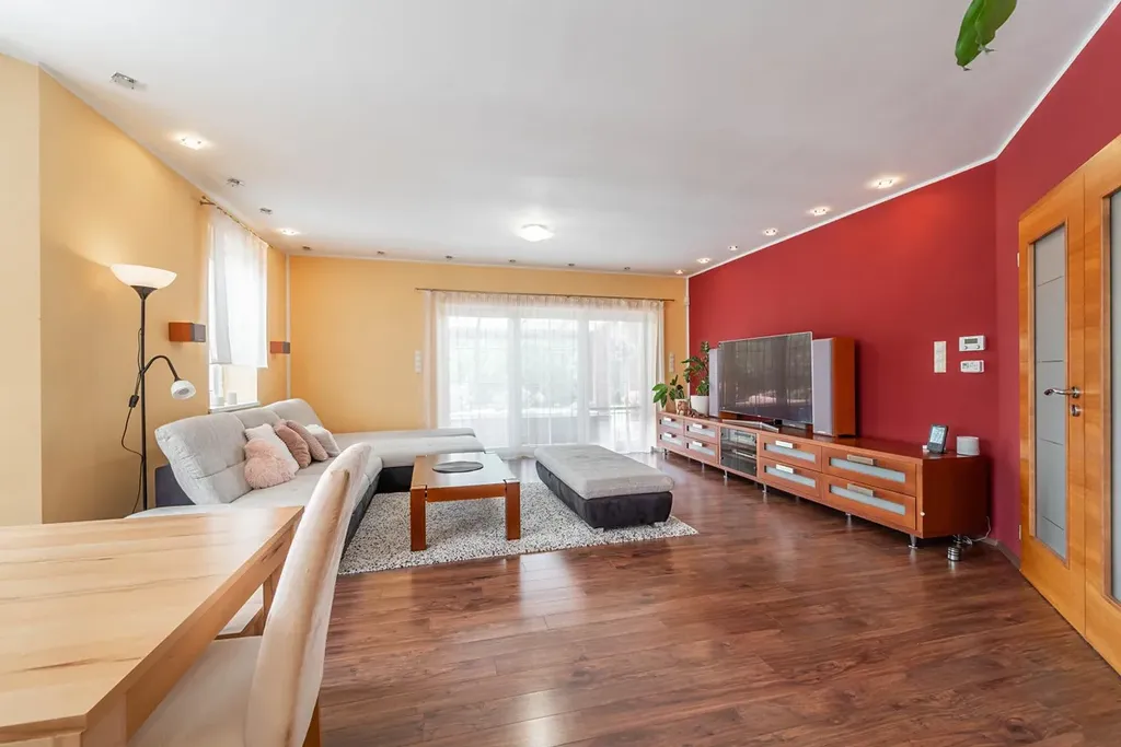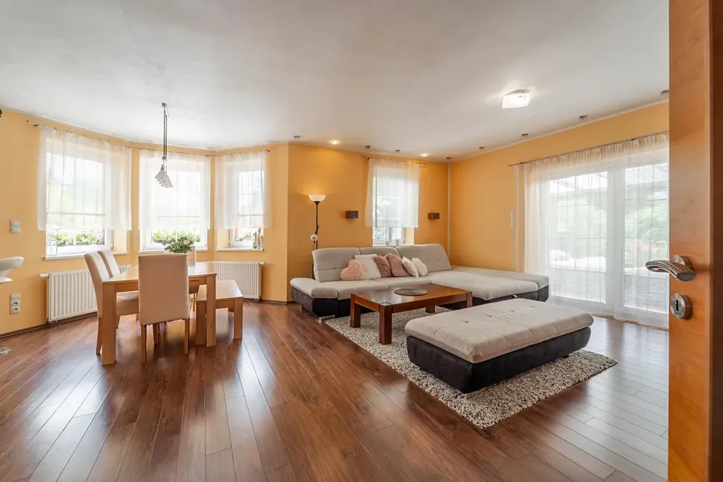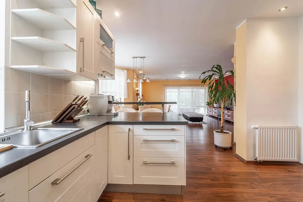 V přízemí vás čeká velkorysý obývací pokoj s kuchyňským koutem a jídelnou, ideální pro každodenní život i hosty.
