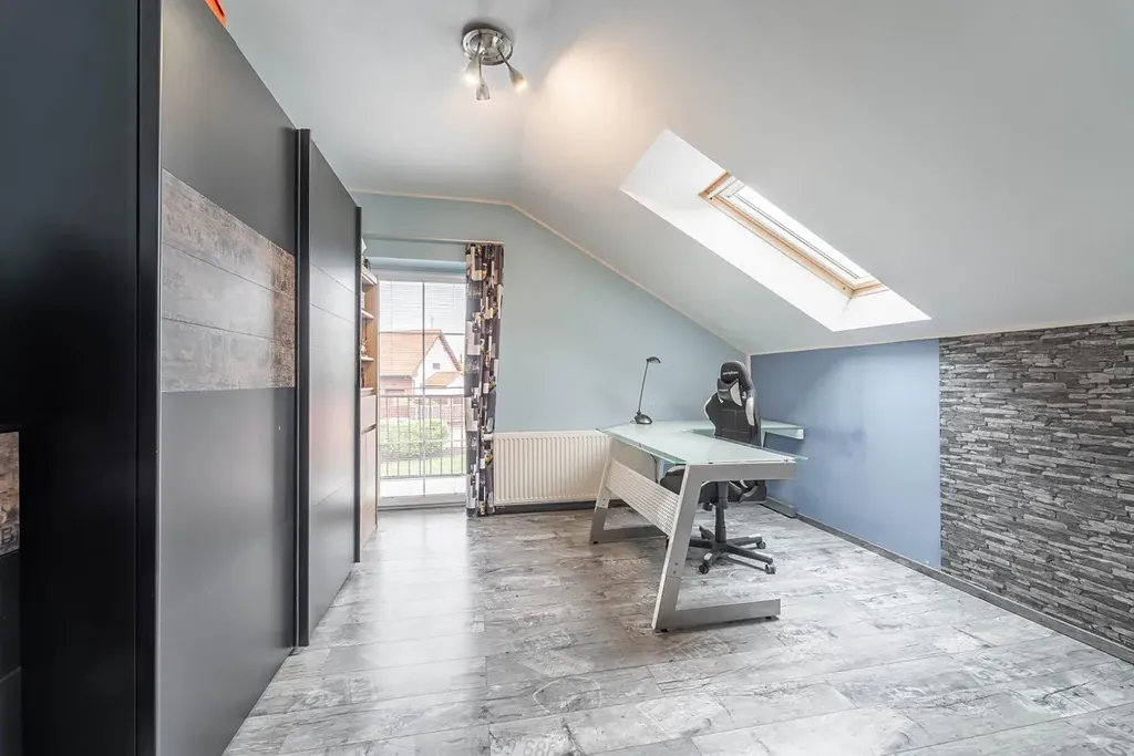 Ve druhém nadzemním podlaží se nachází dva prostorné dětské pokoje se společným balkonem, hlavní ložnice s vlastním balkonem, koupelna, samostatná toaleta a velká šatna, kterou lze snadno využít jako další pokoj. Z tohoto podlaží je přístup na pochozí půdu, která se rozprostírá přes celou délku domu.