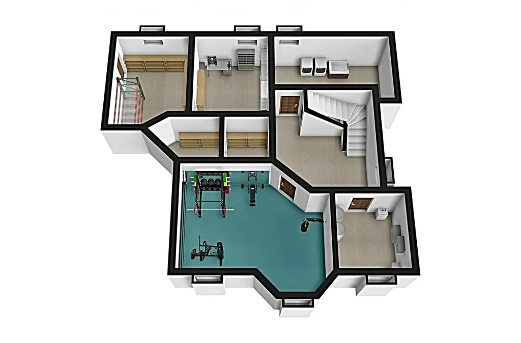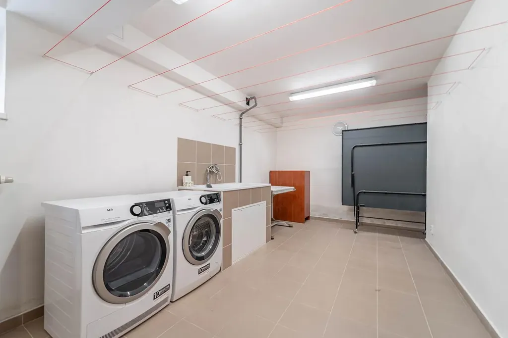 V suterénu, který je tepelně izolovaný, vytápěný a větraný, najdete halu, velkou fitness, prádelnu, security místnost, technickou místnost, domácí dílnu, serverovnu