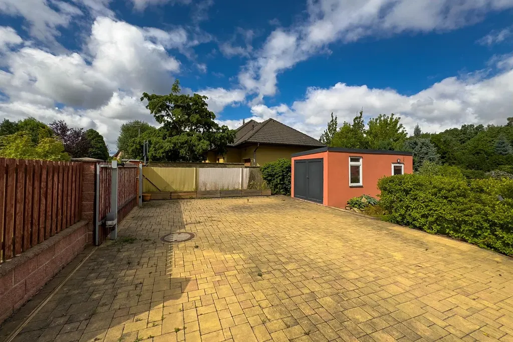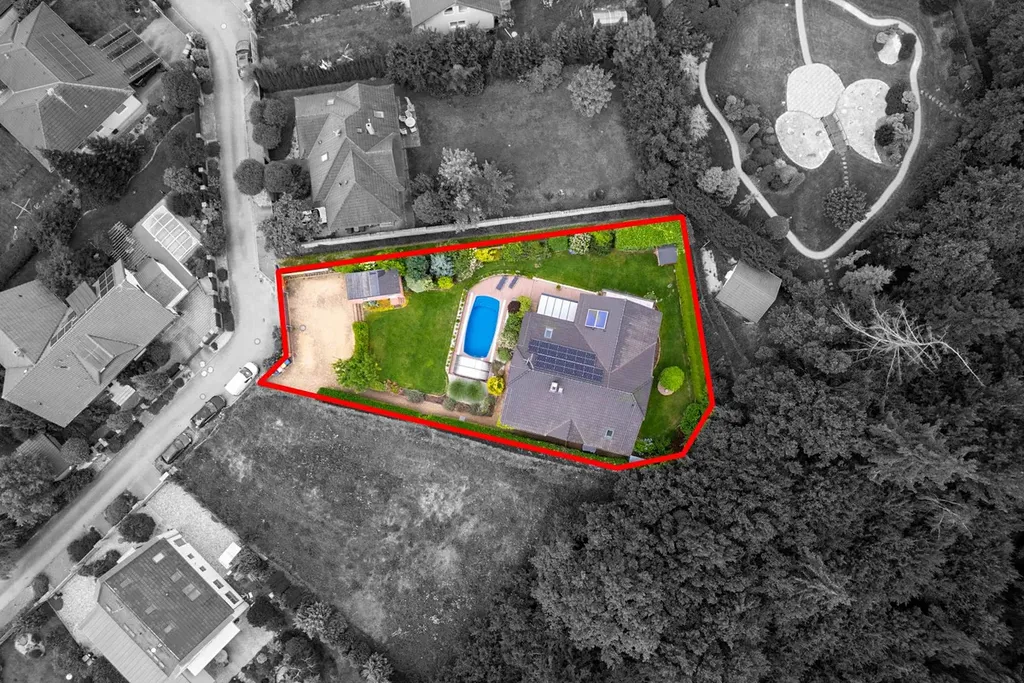Pečlivě upravený pozemek je v jednosměrné ulici s minimálním provozem a přímým přístupem do lesa.