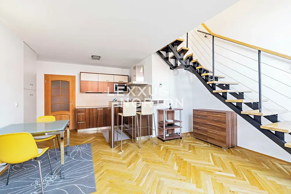 Tento prostorný mezonet k pronájmu se sestává ze 2 pater. Jednotka dispozičně nabízí vstupní halu, obývací pokoj s kuchyňským koutem a jídelní část, ložnice, koupelna, samostatná toaleta a komora. K bytu náleží terasa o velikosti 12 m2 orientovaná do klidného vnitrobloku.