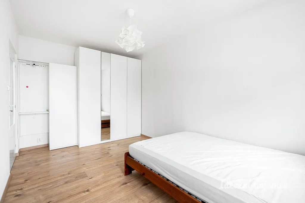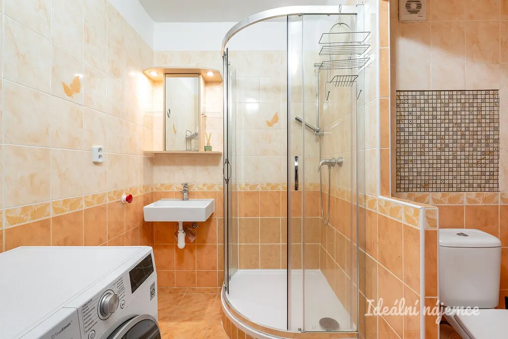 Interiér je nabízen jako částečně vybavený, což budoucím nájemníkům umožňuje doladit si domov podle vlastního vkusu a potřeb. Srdcem bytu je obývací část s pohodlnou sedací soupravou a úložnými prostory, na kterou navazuje plně vybavený kuchyňský kout. V něm najdete lednici s mrazákem, elektrickou i mikrovlnnou troubu, sporák, digestoř a nechybí ani jídelní kout. Součástí bytu jsou dále dva samostatné pokoje, které nabízejí variabilní využití jako ložnice, dětský pokoj nebo klidná pracovna. Koupelna disponuje sprchovým koutem, umyvadlem, pračkou a toaletou.