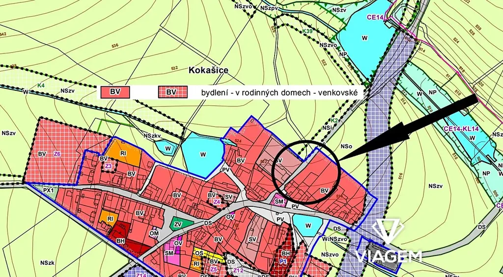 Pozemky jsou v územním plánu vedené jako BV (bydlení v rodinných domech - venkovské), koeficient zastavitelnosti je 40% pozemku a výšková regulace pozemku je maximálně 10 m.