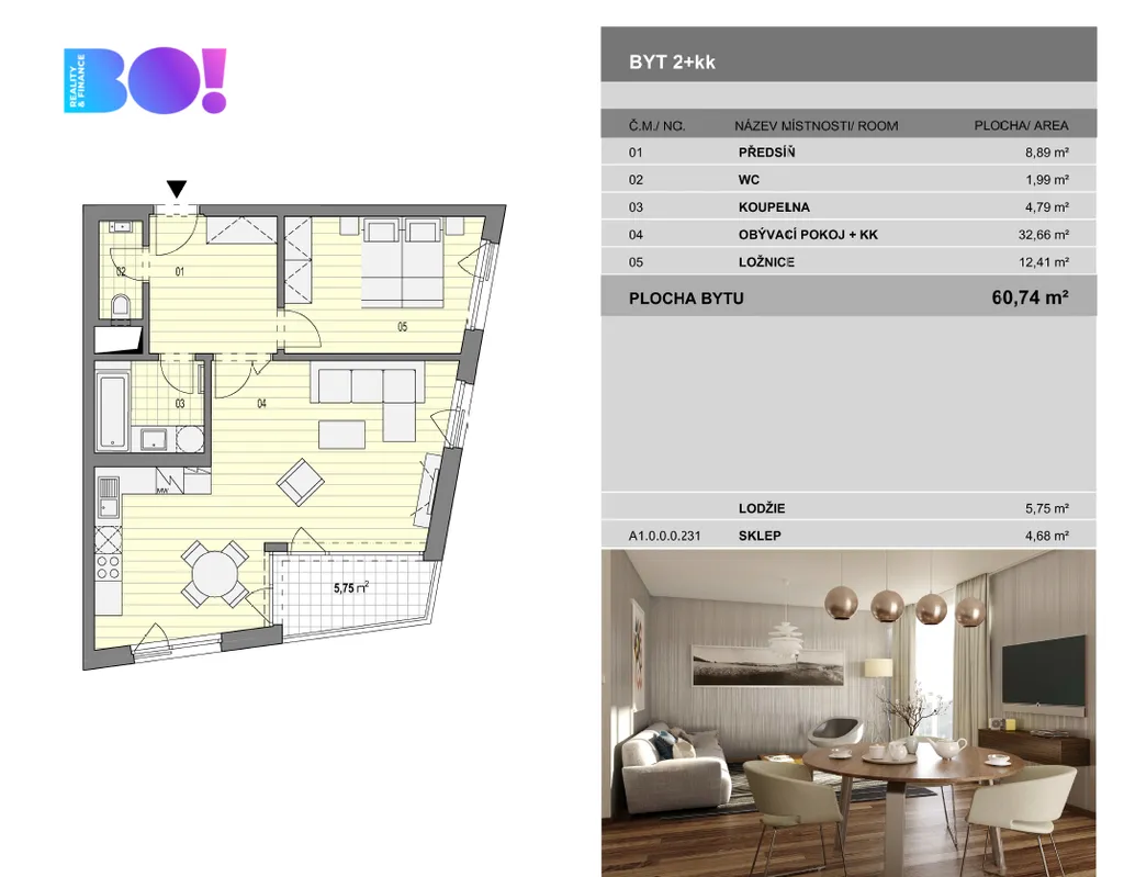 Byt o podlahové ploše 61 m² s lodžií 6 m² je šikovně dispozičně řešen tak, aby nabízel dostatek prostoru pro komfortní život.