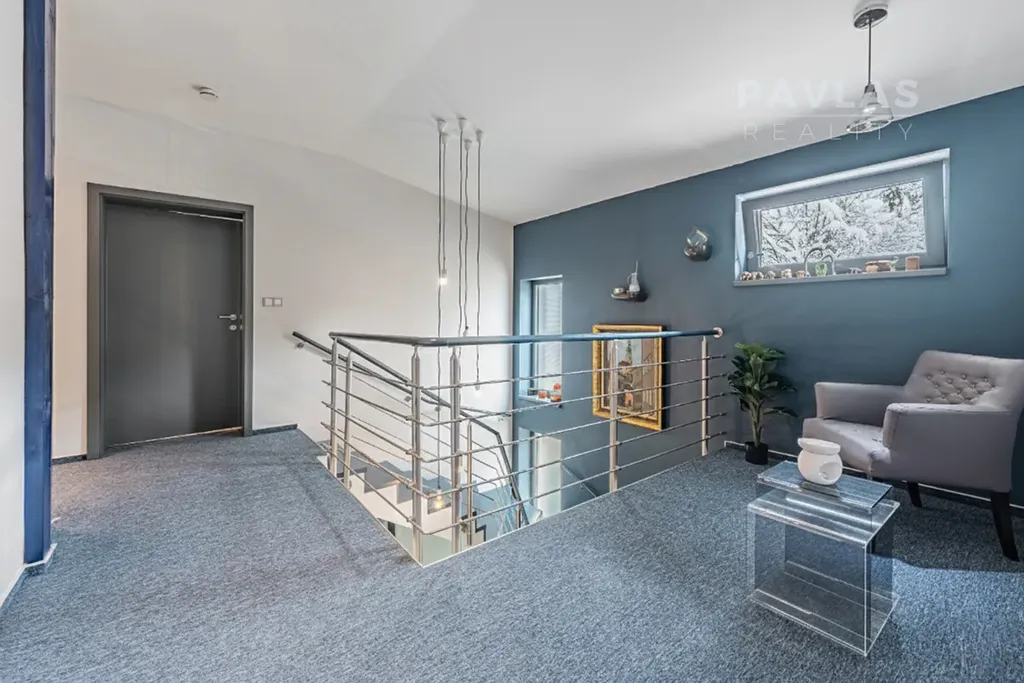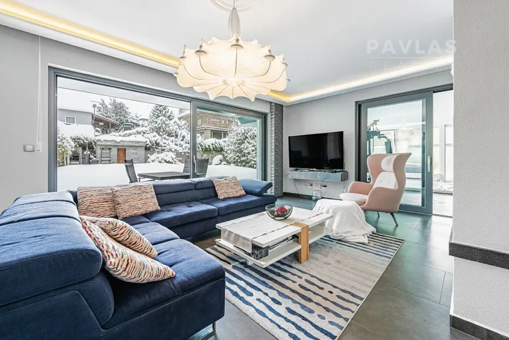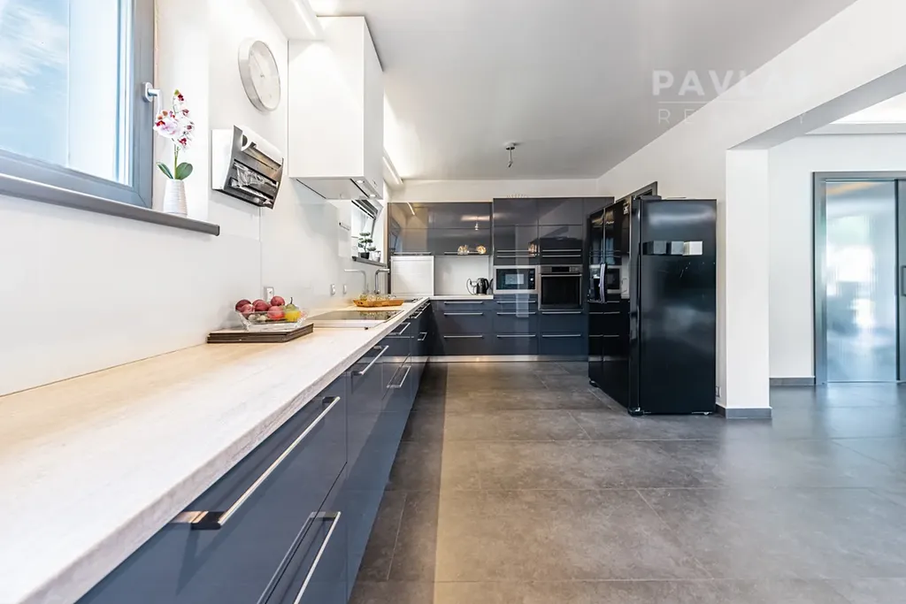 Dominantou celého domu je velkorysý obývací pokoj volně navazující na kuchyni; srdce domova, ideální pro rodinnou pohodu i setkávání s přáteli. K tomu pět prostorných samostatných ložnic, tři elegantní koupelny a dvě rozlehlé terasy, které nabízejí prostor pro ranní kávu i večerní relax pod širým nebem. Celý spodní trakt domu je vybaven velkými portálovými okny, díky kterým je každý kout příjemně prosvětlen denním světlem a interiér plynule propojen se zahradou i terasami.