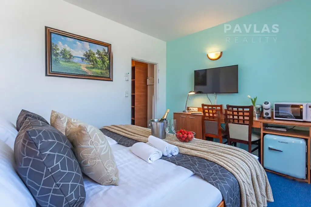 DISPOZICE A VYBAVENÍ Apartmán ve 4. patře s výtahem je orientován na komfort a bezstarostný provoz. Jednotka prošla modernizací, má nový nábytek, obklady i sanitu. Součástí ceny je kompletní vybavení: nábytek, TV, lednice, vestavěné skříně, jídelní a psací stůl, mikrovlnná trouba, kávovar a další spotřebiče. Apartmán je ihned připraven k užívání nebo pronájmu. Zavedené hodnocení na portálu Booking.com ve výši 8,7 garantuje stabilní obsazenost a skvělé reference.