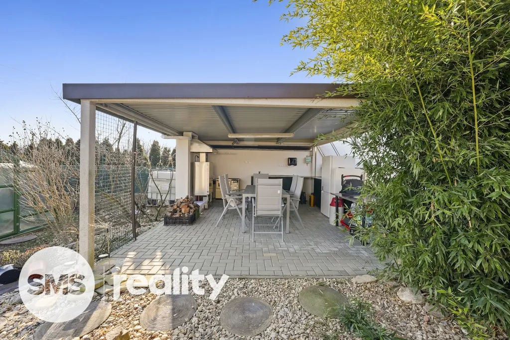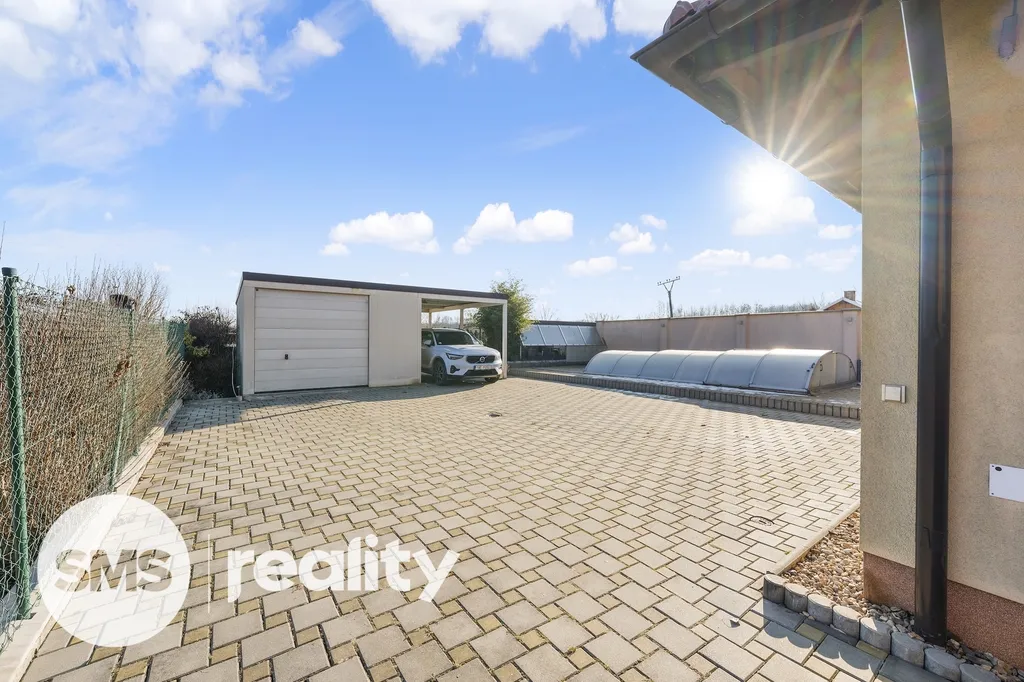 K domu přiléhá oplocená prostorná zahrada a nádvoří se samostatně stojící garáží o velikosti 23 m² a dalším zastřešeným parkovacím místem, zastřešeným posezením s grilem (22 m²) a nakonec krytým bazénem se slanou vodou. Na oplocené zahradě pak najdete dostatek prostoru jak pro Vás, tak i pro Vaše děti. Najdete zde i skleník pro pěstování bylinek či čerstvé zeleniny.