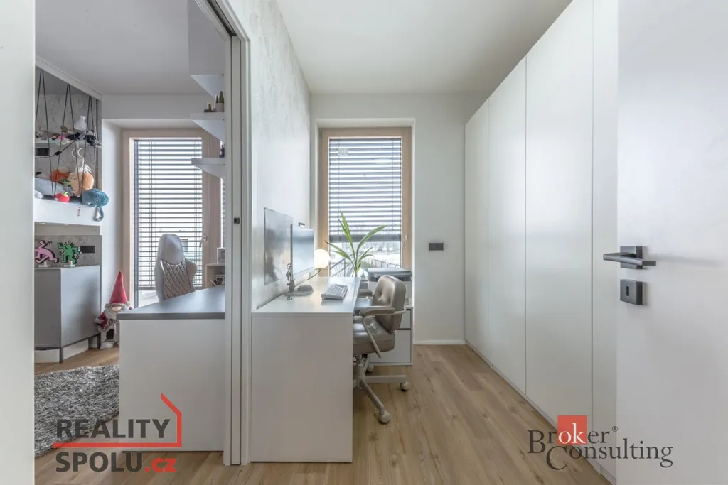 Kuchyně je vybavena kvalitními vestavěnými spotřebiči a nabízí dostatek úložných prostor. Dům disponuje třemi samostatnými pokoji - ložnice, 2x dětské pokoje + pracovna.