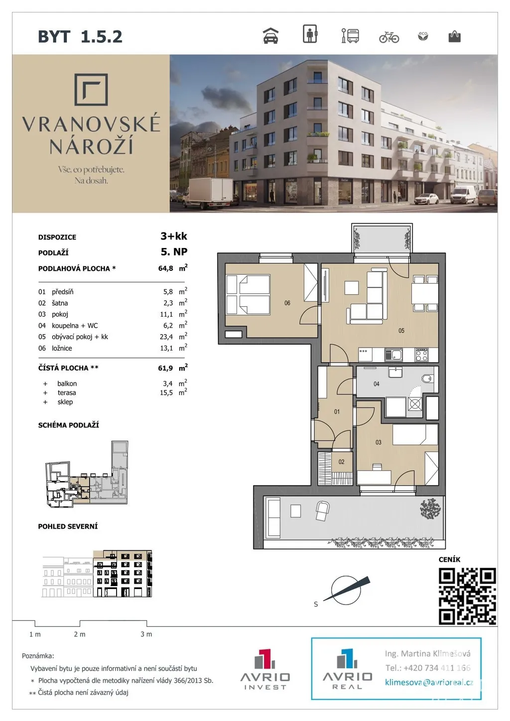 Představujeme Vám střešní byt o dispozici 3+kk a výměře 62 m² v projektu Vranovské nároží. Byt přináší klidné a prakticky řešené bydlení.