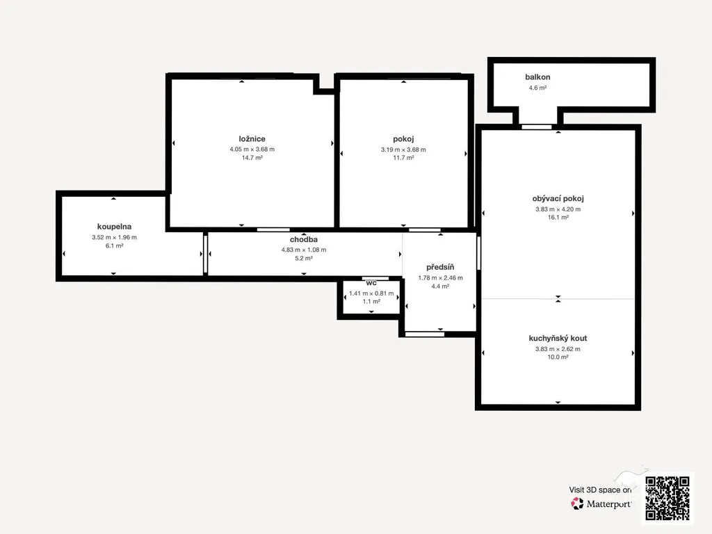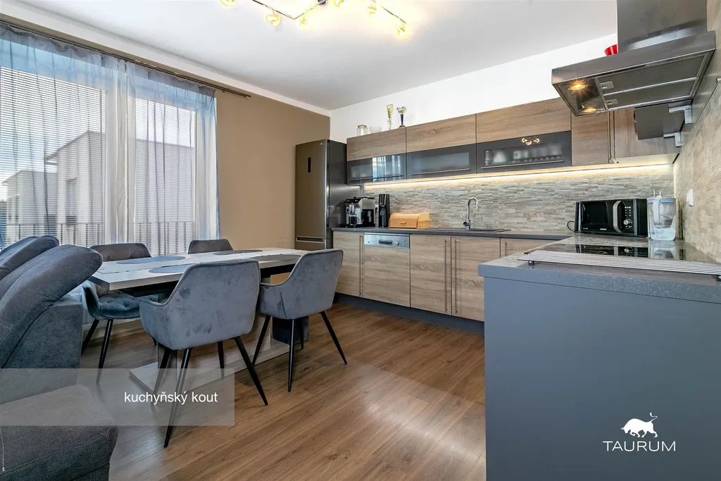 Byt má výměru 76 m2. Je umístěný ve 2. patře novostavby z roku 2018. Patří k němu jak sklep/komora na patře hned vedle bytu, tak jedno venkovní parkovací stání před domem. Byt má vlastní balkon, orientovaný na jih. Od doby výstavby majitelé byt již jednou malovali, nechali nainstalovat sítě do oken a žaluzie. Kuchyňská linka je moderní, vybavená zabudovanými spotřebiči.
