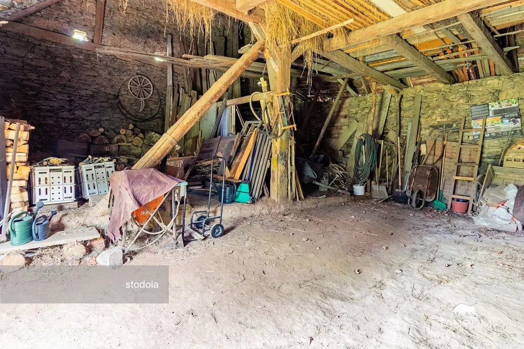 Prostorná chalupa je umístěna na pozemku o celkové rozloze 2210 m² . K dispozici je udržovaná zahrada, dále na pozemku nalezneme velkou stodolu o výměře 124 m² se zavedenou elektřinou (možno využít na uskladnění věcí i jako garáž), samostatný sklep a sad se vzrostlými ovocnými stromy.
