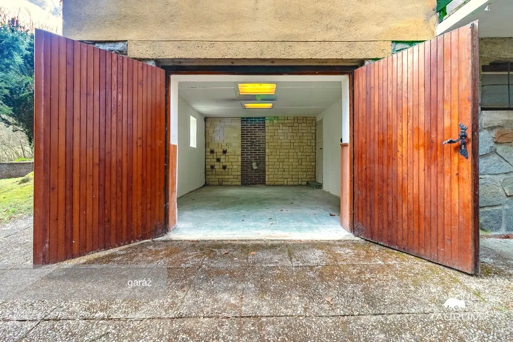 Chata je dvoupodlažní. Ve spodním podlaží je velký prostor, který může sloužit jako sklad lodí, nebo menší garáž, nebo jej lze předělat na obytnou místnost. Příjezdová cesta vede až k tomuto prostoru. Dále je zde předsíň a sauna s ochlazovací vanou (sedací vana, sprcha, výhřevné těleso). V horním podlaží, které je přístupné jak zevnitř ze spodního podlaží, tak i zvenku samostatným vchodem je: velký obývací prostor s jídelním koutem, 2 malé ložnice, kuchyň, koupelna se sprchovým koutem a venkovní terasa přístupná z obývacího pokoje. Wc je umístěné také v horním podlaží a má samostatný vchod vedle vstupních dveří do chaty. Nad chatou je pěkná rovinatá terasa se započatou udírnou, kterou by pro užívání bylo potřeba dodělat a místem na ohniště. Nad celou chatou je také půdní prostor přístupný po žebříku zevnitř chaty z chodbičky.