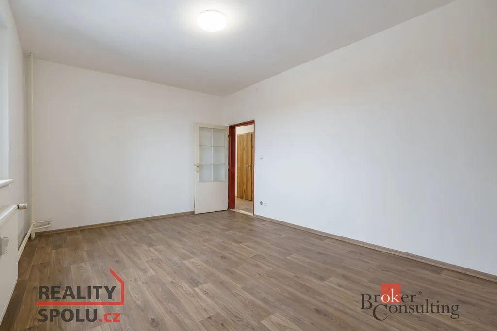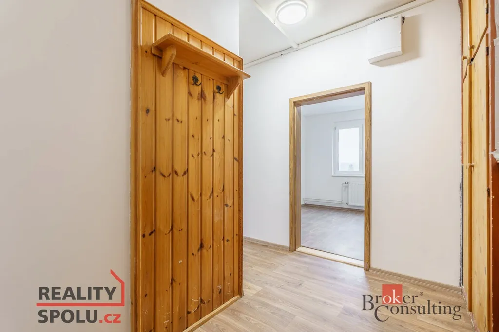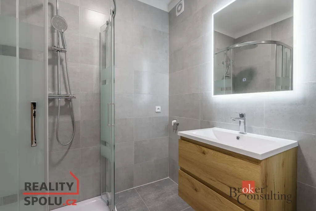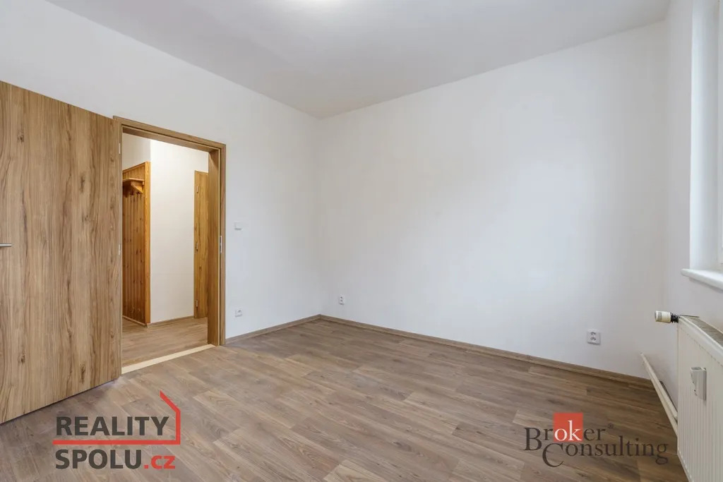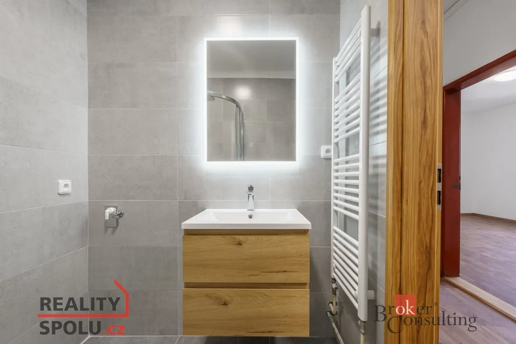 Byt právě prošel částečnou rekonstrukcí – působí čistě, moderně a je připraven k nastěhování. Dispozice je praktická: samostatná kuchyně, dva neprůchozí pokoje, koupelna a oddělené WC. Koupelna je řešena v moderním šedém tónu, včetně sprchového koutu a umyvadlové skříňky; toaleta je samostatná. Kuchyně je vybavena kuchyňskou linkou a spotřebiči, dostatek prostoru zůstává i pro jídelní stůl.