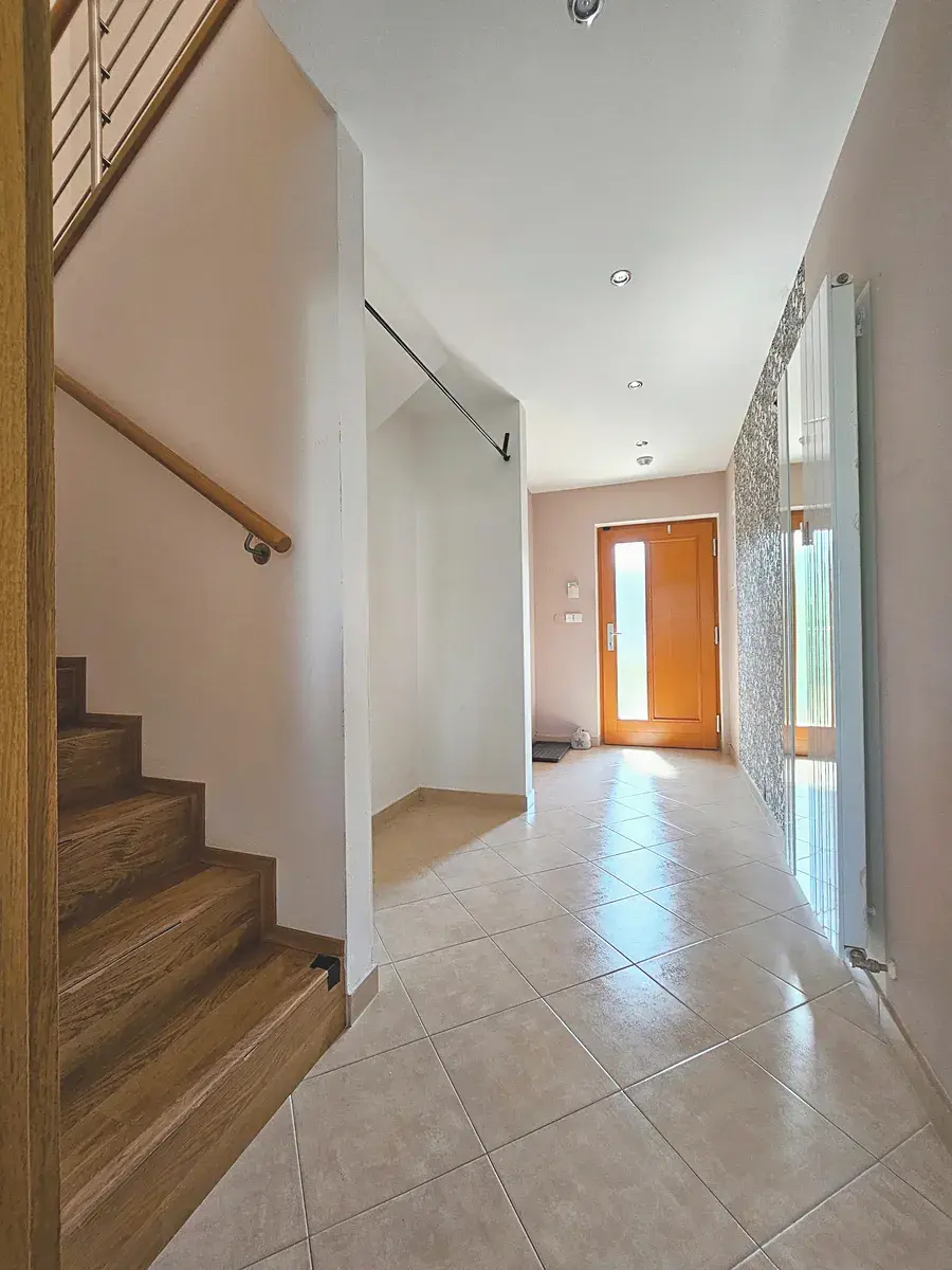 Přízemí: Dominantou je prosluněný obývací pokoj propojený s plně vybavenou kuchyní a jídelnou, odkud je přímý vstup na zahradu o výměře 91 m² – ideální velikost pro relaxaci bez nutnosti náročné údržby. Dále zde najdete koupelnu se sprchovým koutem a praktickou technickou místnost (místo pro pračku, sušičku i úložné prostory). Samozřejmostí je přímý vstup do vlastní garáže.