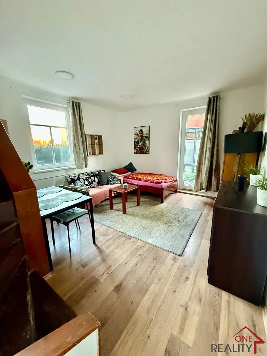 V přízemí je vstupní chodba, kuchyně se spotřebiči ( lednice, mikrovlnná trouba, sporák, pračka), koupelna s vanou, umyvadlem a WC , obývací místnost s balkonovými dveřmi, v 1.NP jsou dva samostatné pokoje.