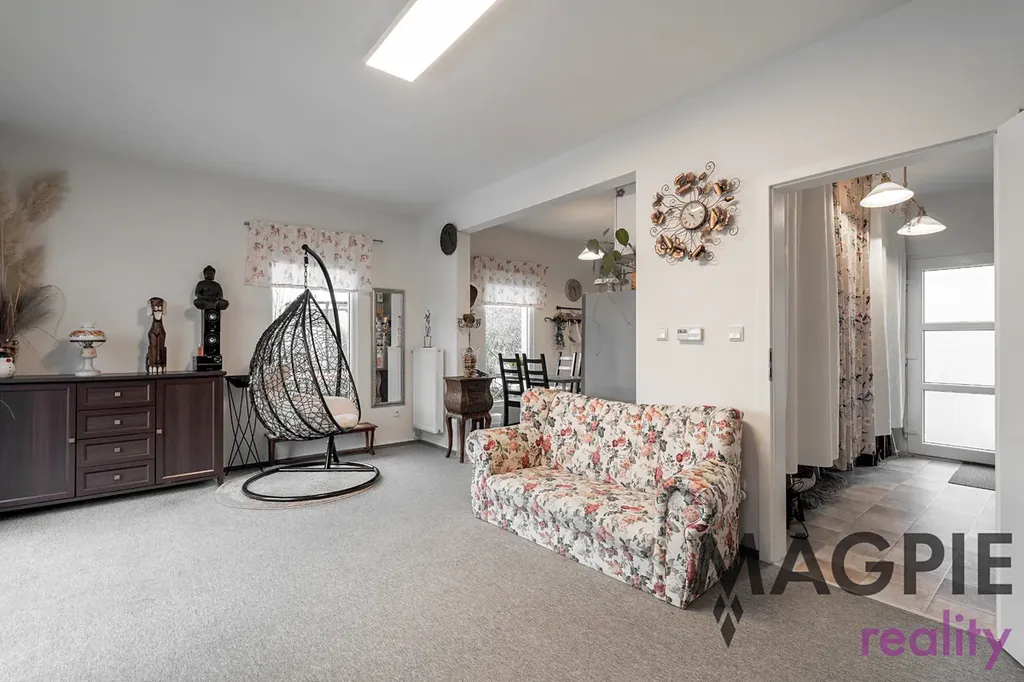 Přízemí tvoří zádveří (6,5m2), ze kterého vstupujeme do obývacího pokoje (31 m2) s kompletně vybaveným kuchyňským koutem. Vedle běžných spotřebičů je součástí kuchyně i velký mrazák. Kuchyňská linka je vybavena kamennou deskou. Obývací místnost poskytuje vstup na terasu a zahradu, velké prosklené dveře příjemně prosvětlí celý prostor, stejně jako okna v kuchyni.