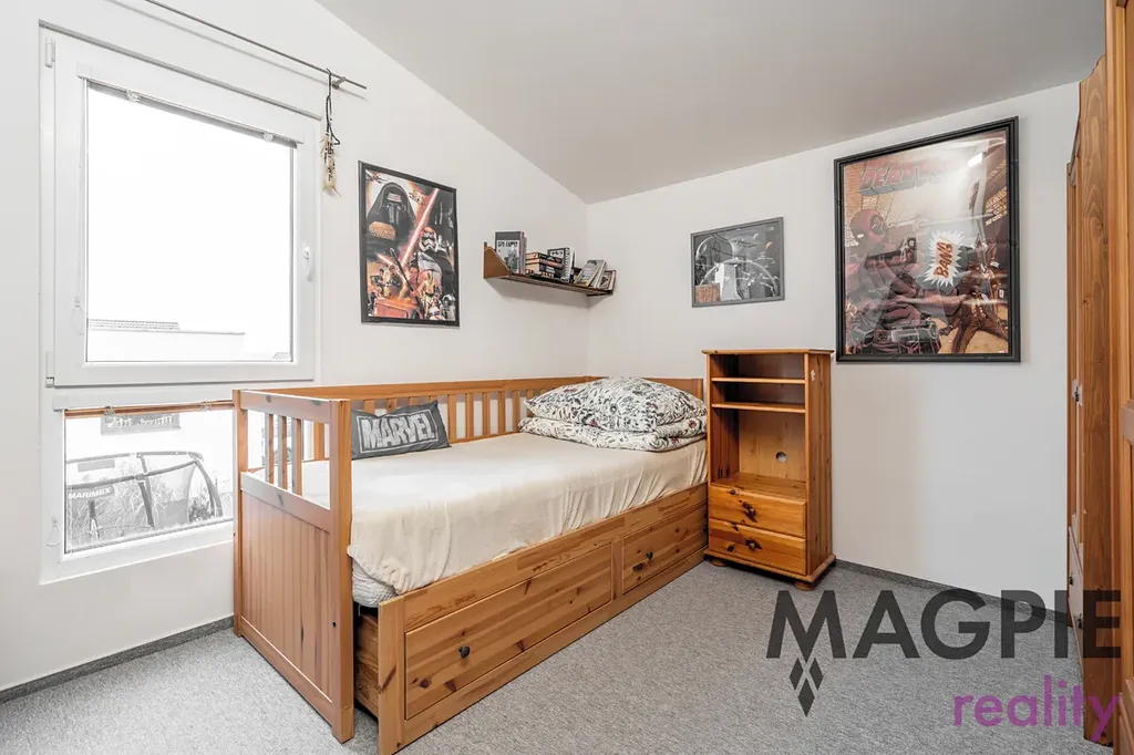 Schodiště do druhého podlaží vede rovněž ze zádveří. V patře jsou 3 útulné ložnice o rozměrech 8m2, 12m2 a 9m2 a koupelna s WC. Všechny pokoje jsou osvětlené velkými okny s výhledem do zahrady. V zádveří je dále vstup na samostatné WC.