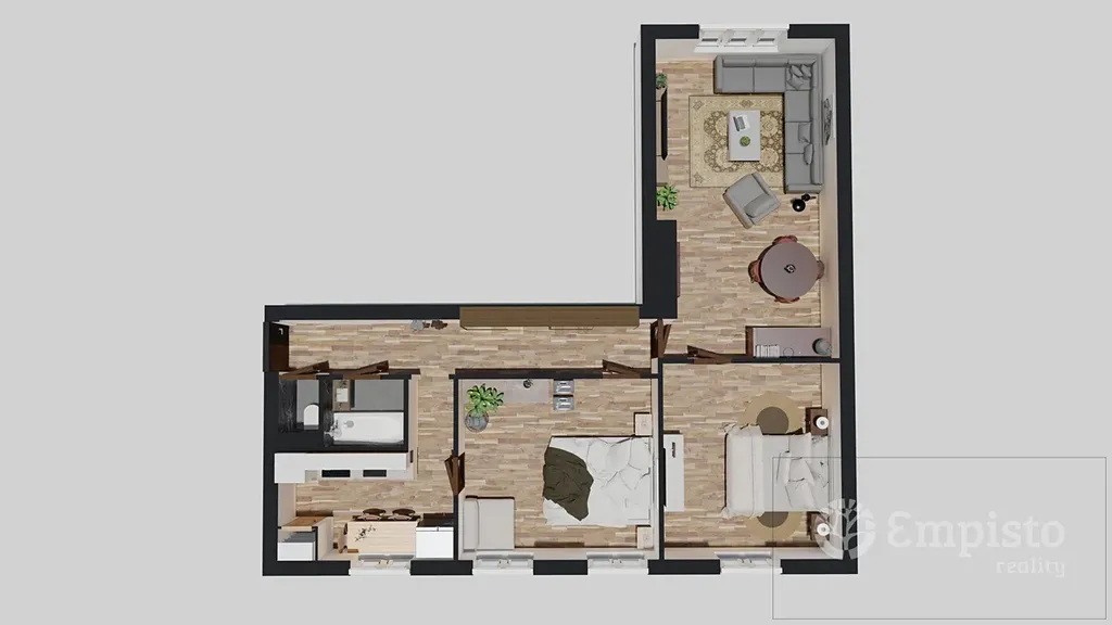 Nechte svou kreativitu volně plynout! Byt je v původním stavu a čeká, až ho proměníte v domov přesně podle svých představ. Pro inspiraci vám nabízíme dvě ukázky, jak by mohl vypadat. Jedna věc, na kterou se můžete spolehnout, je nová elektroinstalace.