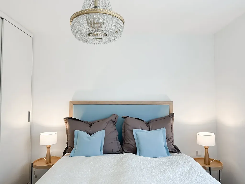 V 6. patře se nachází obývací pokoj s plně vybaveným kuchyňským koutem vybavený klimatizací, úložný prostor a toaleta. V 7. patře naleznete dvě ložnice, z nichž je jedna vybavena klimatizací, prémiovým designovým nábytkem BEUDER. Další ložnice je vybavena vestavěnými skříněmi, psacím stolem s křeslem, manželkou postelí a výhledem na Žižkovskou věž. Horní patro nabízí také koupelnu s vanou, sprchovým koutem, toaletou, bidetem a vestavěnou skříní, kde naleznete pračku se sušičkou.