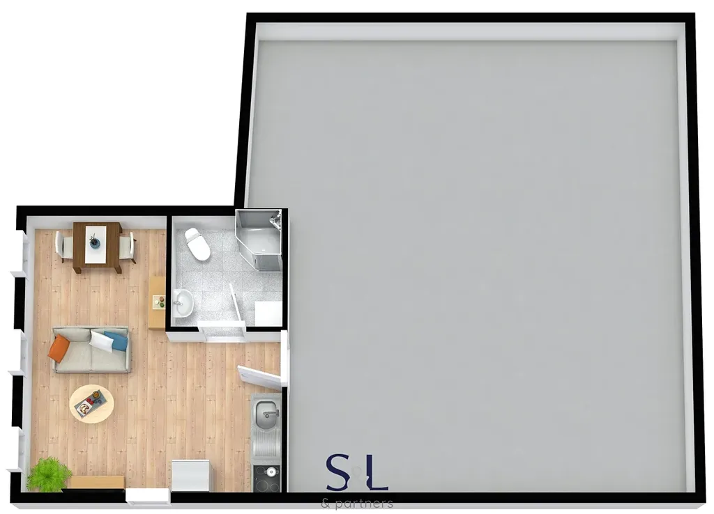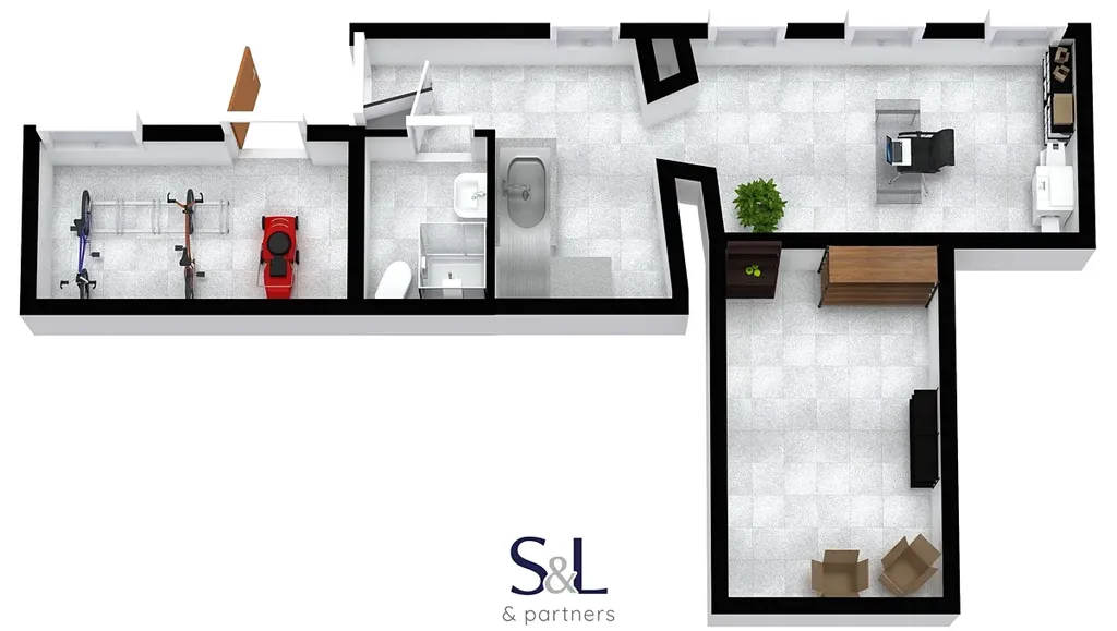 - nebytový prostor zvenku s kuchyňským koutem a koupelnou – 22 m² (kancelář, služby apod. – vhodné na pronájem).