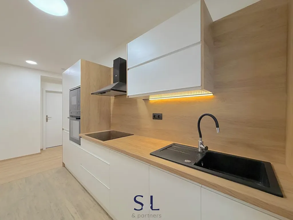 Kuchyň je vybavena moderní kuchyňskou linkou s vestavěnými spotřebiči – varná deska, elektrická trouba, mikrovlnná trouba, digestoř s odtahem a myčka nádobí.
