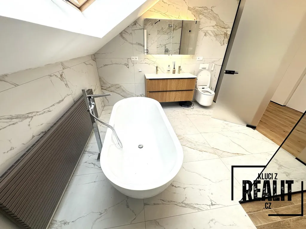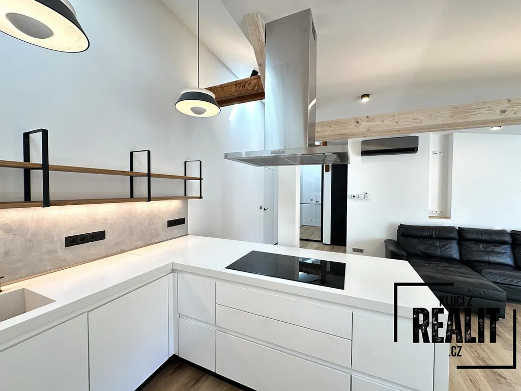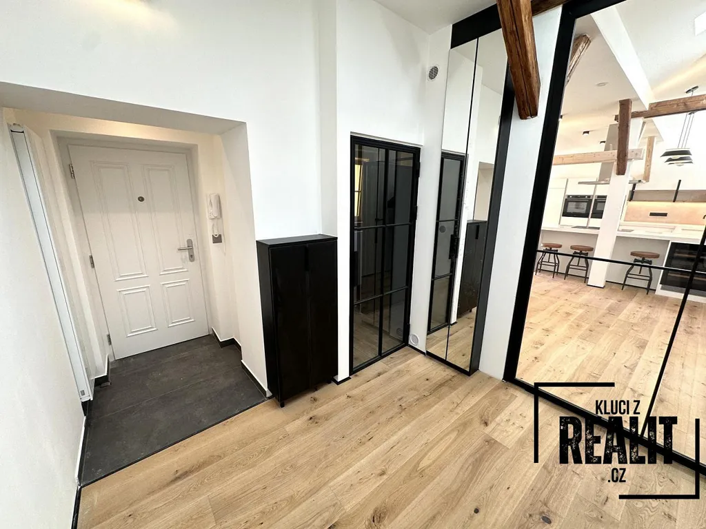 Ze vstupní chodby je přístup do technické místnosti, dětského pokoje, koupelny se sprchovým koutem s infračerveným světlem a bidetovým záchodem pro hosty a obývacího pokoje s prostornou a vybavenou kuchyňskou linkou a přístupem na terasu, která směřuje do klidného vnitrobloku s výhledem na vrch Petřín. Kuchyň je vybavena myčkou, troubou, indukčním vařičem, lednicí, mrazákem, mikrovlnou troubou, vinotékou a ohřívačem talířů.