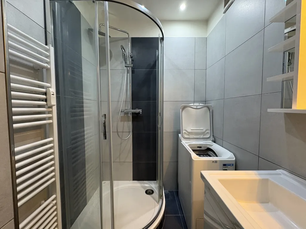 Koupelna je vybavena sprchovým koutem, umyvadlem se skříňkou a pračkou.