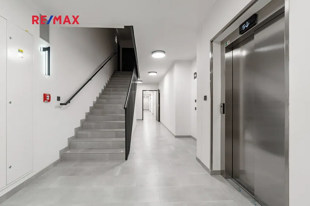 Byt je umístěn v 1.NP s výhledem do vnitrobloku. Budova má v úrovni terénu garážová stání a nad nimi je teprve 1.NP, tedy v jiné budově by označení podlaží bytu bylo v 2.NP.