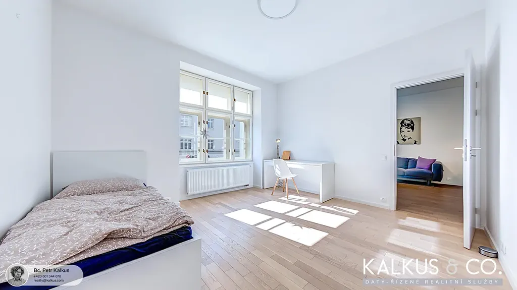 Z ložnice s vestavěnou šatní skříní a dvoulůžkovou postelí s nočními stolky je přístup do oddělené šatny. Ve třetím pokoji je k dispozici postel a pracovní stůl. Koupelna se dvěma umyvadly je oddělena od WC (s umyvadlem). V technické vestavné skříni je k dispozici pračka a sušička.