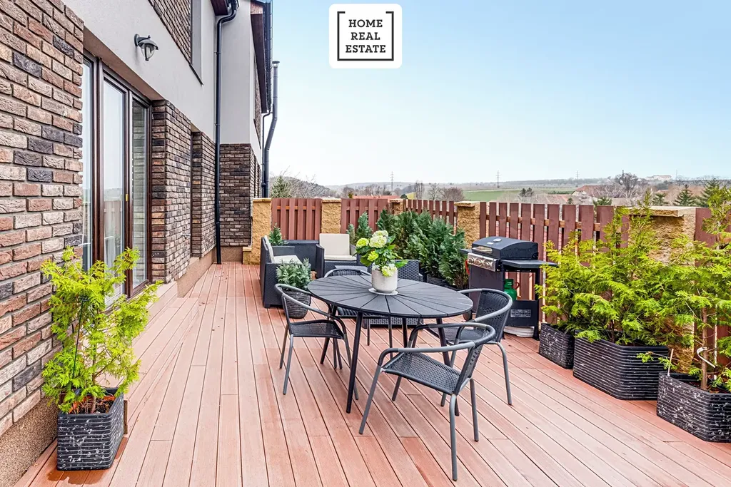 Obývací pokoj s kuchyňským koutem a spižírnou nabízí přímý vstup na terasu se zahrádkou. Master ložnice má vlastní sociální zařízení s WC, sprchovým koutem a umyvadlem. Dům má dále dvě dětské ložnice. Zahrada a terasa poskytují dostatek soukromí a nádherný výhled na hory Říp a Milešovka.