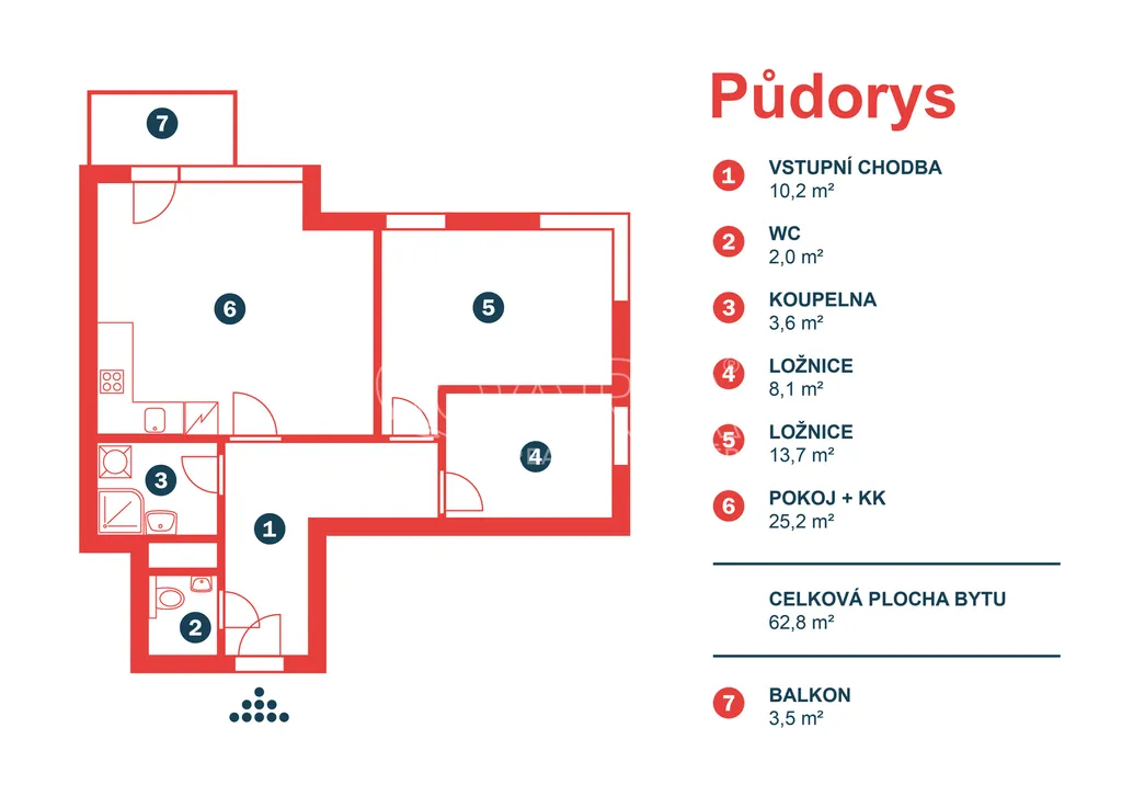 Byt o celkové výměře 66,3 m² (vnitřní plocha – 62,8 m², balkon – 3,5 m²) je vyřešen velmi prakticky a tvoří jej: vstupní chodba, koupelna se sprchovým koutem, samostatné WC, obývací pokoj s kuchyňským koutem a 2x ložnice. Z obývacího pokoje je možný vstup balkon, který je orientován na jih. Podlaha je v celém bytě plovoucí, v koupelně a v předsíni je položena dlažba. Vytápění zajišťuje vlastní plynový kotel, který je umístěn v koupelně. Dům je vybaven výtahem. Měsíční poplatky za byt jsou ve výši 4 122,- Kč + spotřeba elektřiny a plynu.