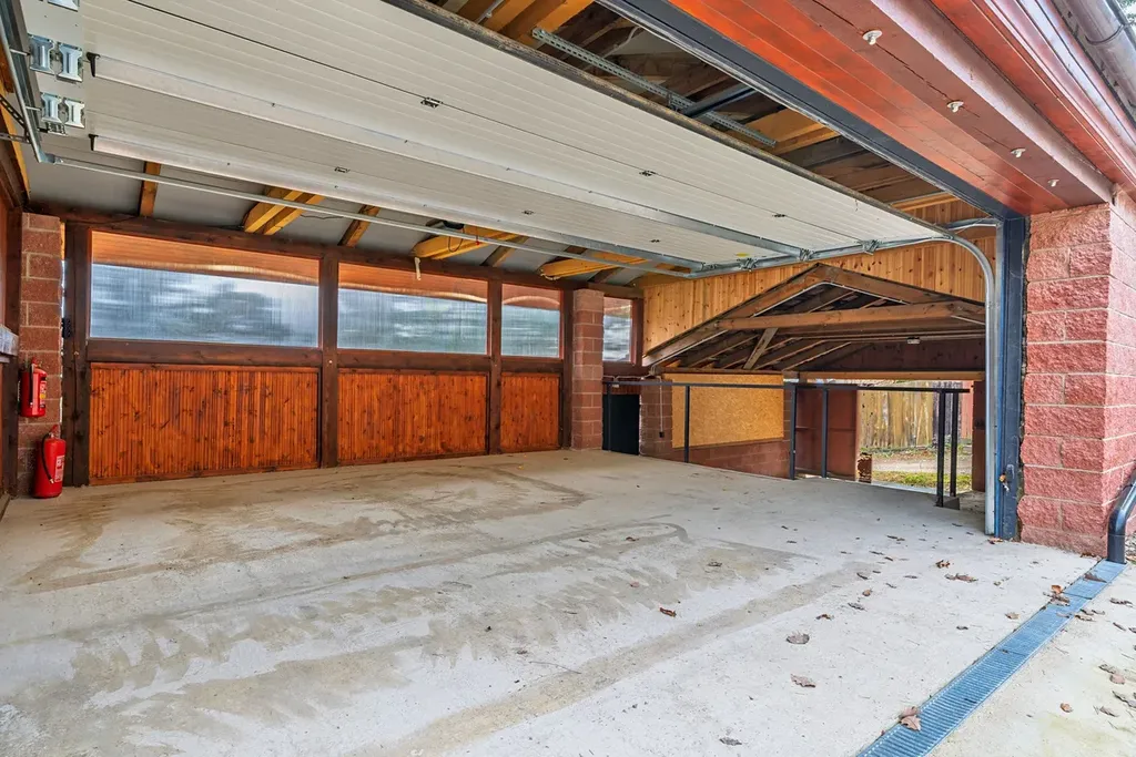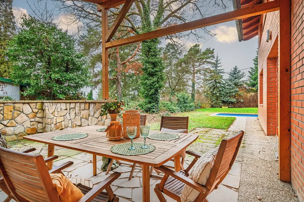 Nový bazén s protiproudem, pergola s venkovní kuchyní a pecí na pizzu, kůlna a garáž pro 3 auta.