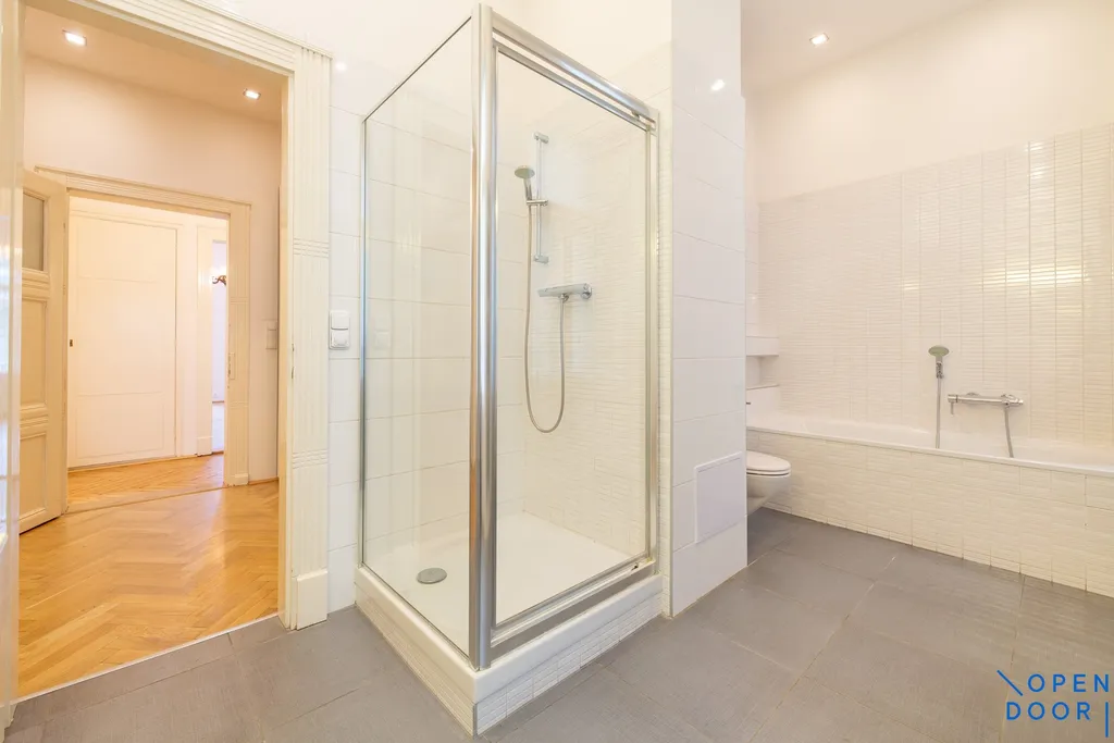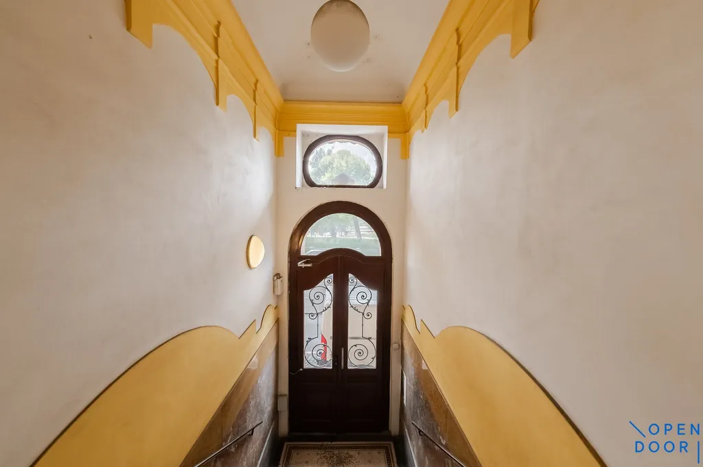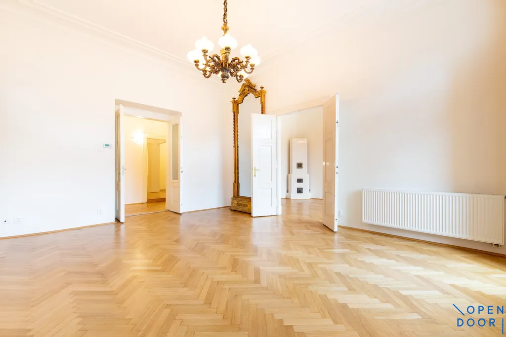 Byt je situován napříč domem, z prostorné vstupní haly je po pravé straně vstup do dvou velkých reprezentativních pokojů směřujících k Vltavě. Větší navazuje na zimní zahradu a je z něj možné vstoupit na malý balkon. Druhý z pokojů je přístupný i z kuchyně. Oba pokoje je možné propojit dvoukřídlými dveřmi. Pohled z oken na Vltavu se Žofínem, budovu Mánesa, Tančící dům a Národní divadlo je krásný. Protilehlá ložnice směřuje do klidného vnitrobloku, má vlastní šatnu a navazuje na velkou koupelnu vybavenou vanou, sprchovým koutem a toaletou. Za chladných dnů je možné využívat elektrické podlahové topení a topný žebřík. Z předsíně vlevo od vchodu do bytu je přístupné druhé samostatné WC a technická místnost s novým kombinovaným plynovým kotlem pro topení a ohřev vody v bytě, je v ní i přípojka na pračku. Z haly je také druhý vchod do kuchyně. Před třemi lety prošel byt částečnou rekonstrukcí (nové topení, rozvody elektřiny a vody, nová kuchyň), s důrazem na zachování některých původních prvků - půvabná dobová kachlová kamna, impozantní starožitné zrcadlo, ve všech obytných místnostech renovované původní parkety, vysoké dveře se skleněnými výplněmi, špaletová okna. V hale jsou vestavěné úložné prostory. K bytu náleží sklep.
