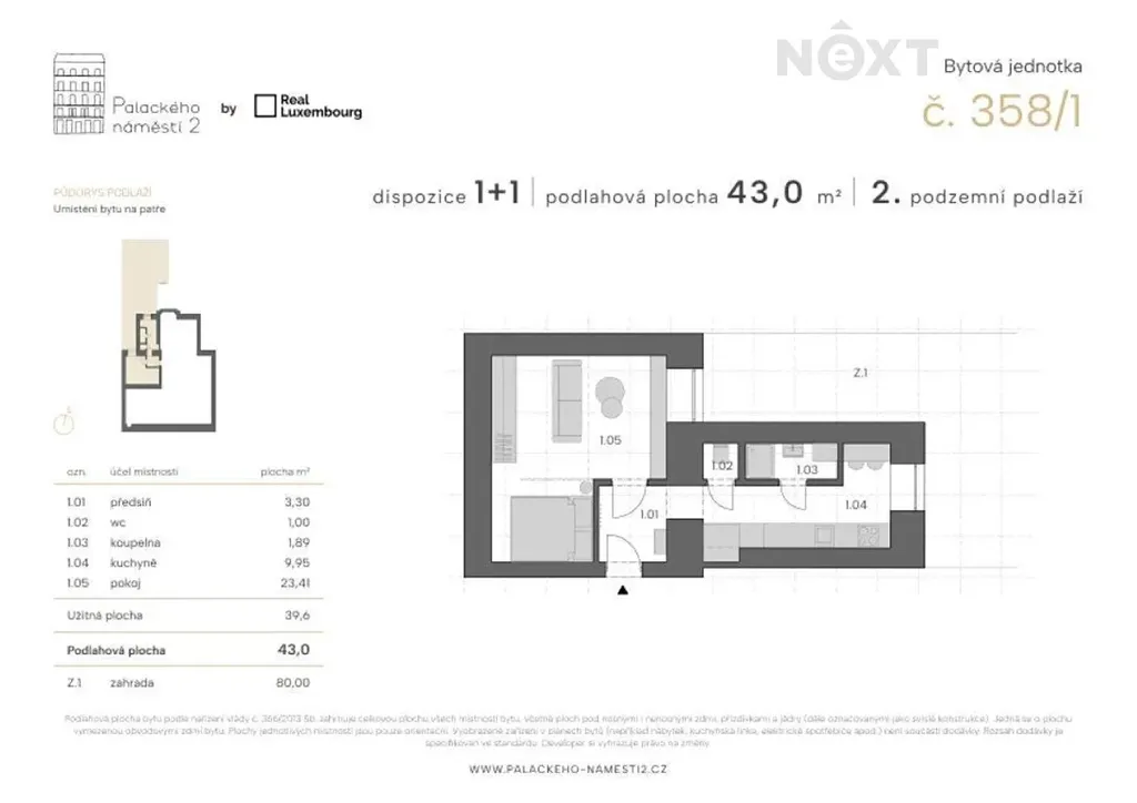 Byt se nachází ve 2. podzemním podlaží (okna s výhledem do vnitrobloku) dobře udržovaného historického domu. Bytová jednotka nabízí prostor pro obývací pokoj, kuchyň s jídelním koutem, k dispozici je také koupelna a samostatné WC. Z kuchyně se dostaneme na prostornou předzahrádku, která je situována v klidném vnitrobloku. K bytu je možno si dokoupit sklepní kóji 2,4 m2.
