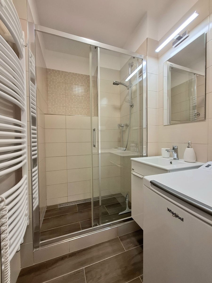 - Zázemí: V koupelně je sprchový kout a pračka. WC je samostatné. Přímo v bytě je také praktická komora.
