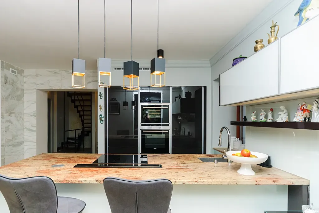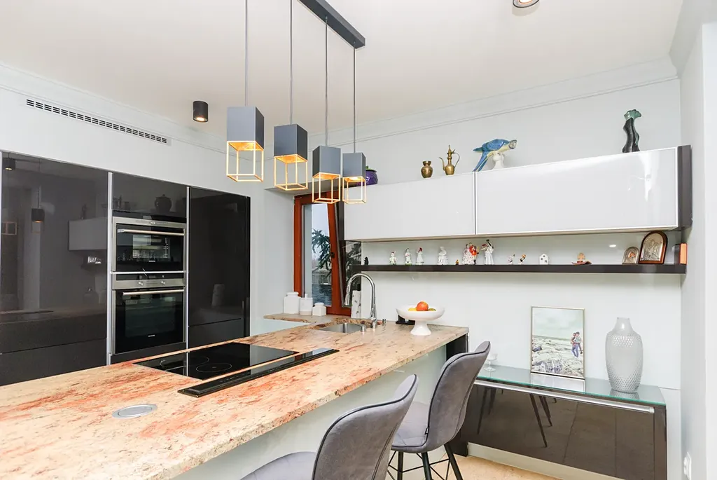 • Kuchyňská linka na míru se spotřebiči Siemens a kamennou pracovní deskou;