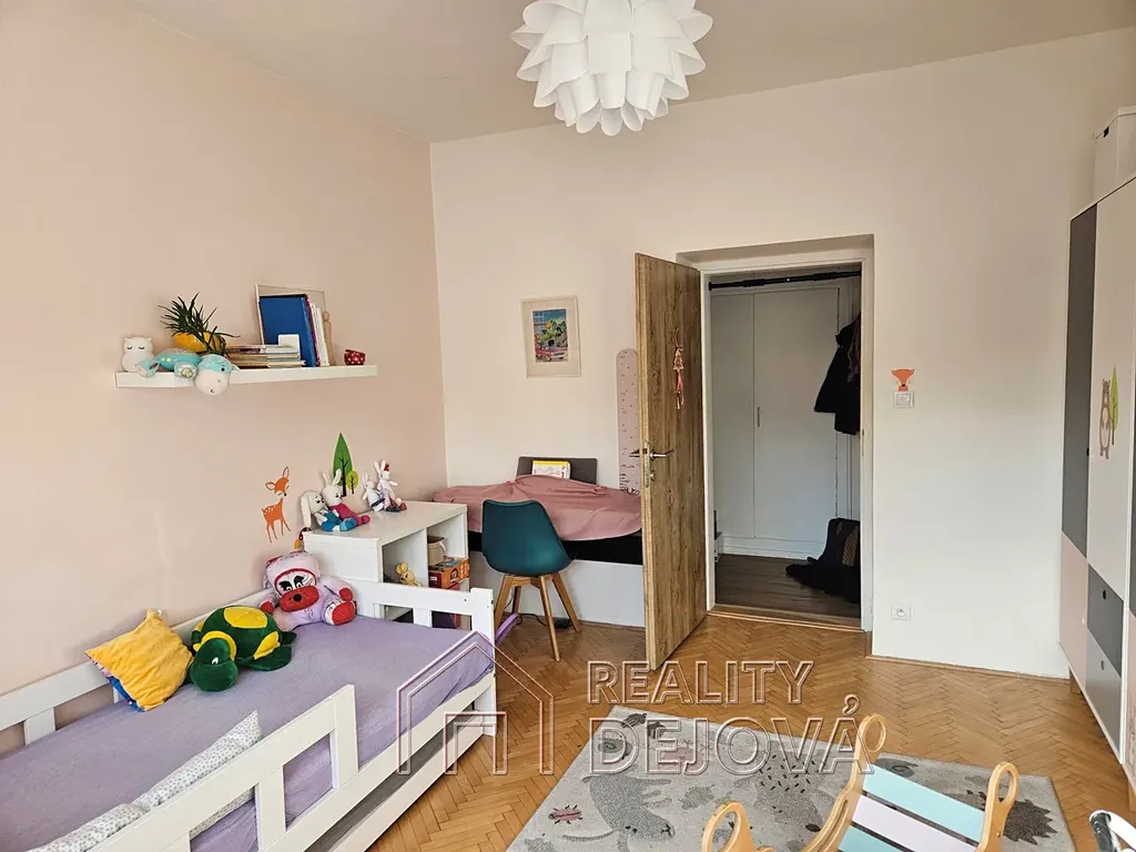 Součástí bytu jsou také dva samostatné pokoje – ložnice a dětský pokoj, které poskytují dostatek soukromí i prostoru pro rodinu.