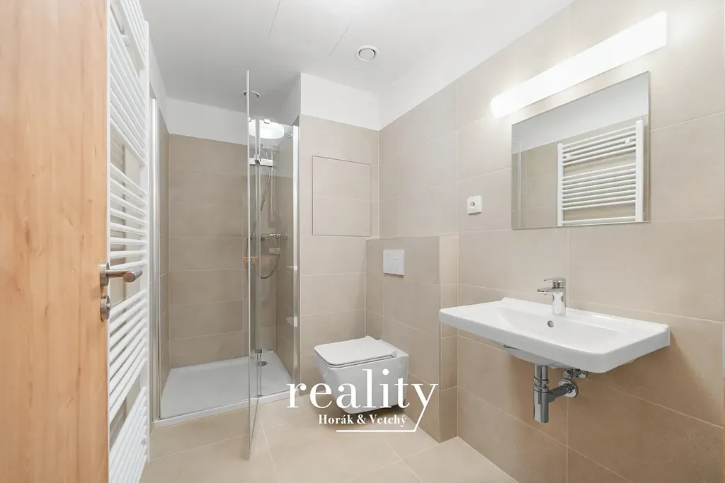 Koupelna nabízí sprchový kout, závěsné WC, koupelnový nábytek. Podlahové vytápění a kvalitní sanitární vybavení jsou samozřejmostí. Součástí vybavení je i pračka a sušička na prádlo.