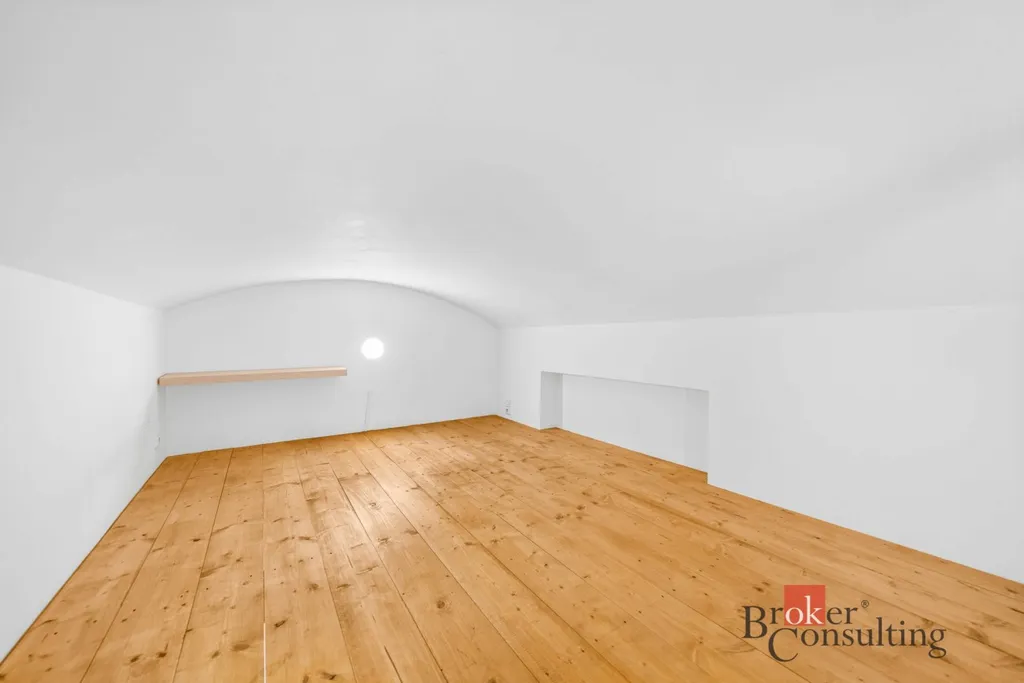 Jedno patro slouží klasicky jako prostor na spaní, druhé je řešeno velmi chytře – může fungovat jako pracovna, knihovna nebo klidová zóna (výška stropu od 150 cm do 180 cm) Ideální kombinace bydlení a home office, případně investiční využití.
