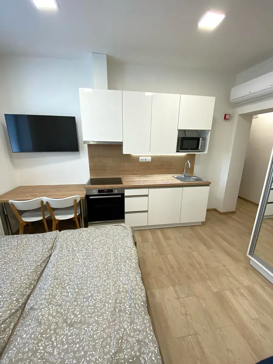 Dispozice a vybavení bytu: Kuchyňský kout se spotřebiči (lednice, varná deska, trouba, myčka, mikrovlnná trouba a digestoř). Koupelna se sprchovým koutem, WC, skříňkou, skříňkou se zrcadlem, topným žebříkem a umyvadlem. Dále je v pokoji klimatizace, vestavěná skříň, stůl, 2 židle, pohovka, Smart TV Samsung a manželská postel s kvalitní matrací s polštářem, přikrývkou, plachtou a povlečením.