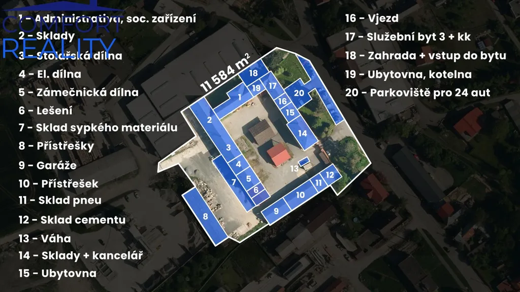 Zázemí je nekompromisní a nabízí vše, co byste jinde museli roky budovat od nuly. Zámečnickou, elektrikářskou i stolařskou dílnu, rozsáhlé sklady, administrativu, byt pro zaměstnance či ubytování pro externí pracovníky (pracovalo zde více jak 50 zaměstnanců). Stavebně se jedná o poctivé objekty s masivními zdmi o tloušťce až 90 cm. Vynikající stav podtrhují střechy z hliníkového plechu na zdravých krovech. Pokud k pozemku o rozloze přes 1,1 hektaru přičtete zpevněné plochy pro manipulaci a nepostradatelnou venkovní auto váhu, získáte vše potřebné na jednom místě.