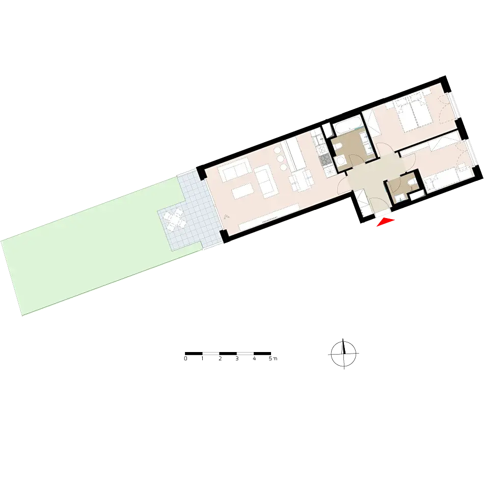 Dominantou bytu je velkorysý obývací prostor s přímým vstupem na zahradu, který poskytuje ideální zázemí pro rodinné posezení i společenská setkání. Zastřešená terasa a zahrada jsou orientovány na západ do klidného, uzavřeného vnitrobloku.