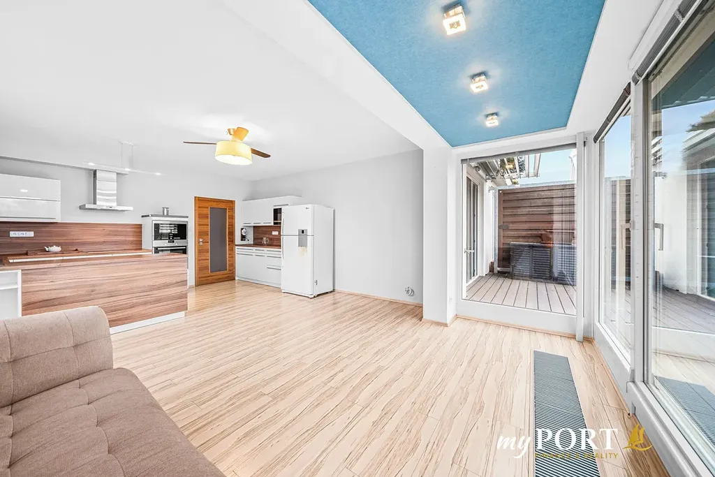 • Obývací pokoj s kuchyňským koutem a s přístupem na terasu. Kuchyňská linka s praktickým ostrůvkem je vybavena spotřebiči Siemens: myčkou, troubou, parní troubou, mikrovlnou troubou, a lednicí LG.
