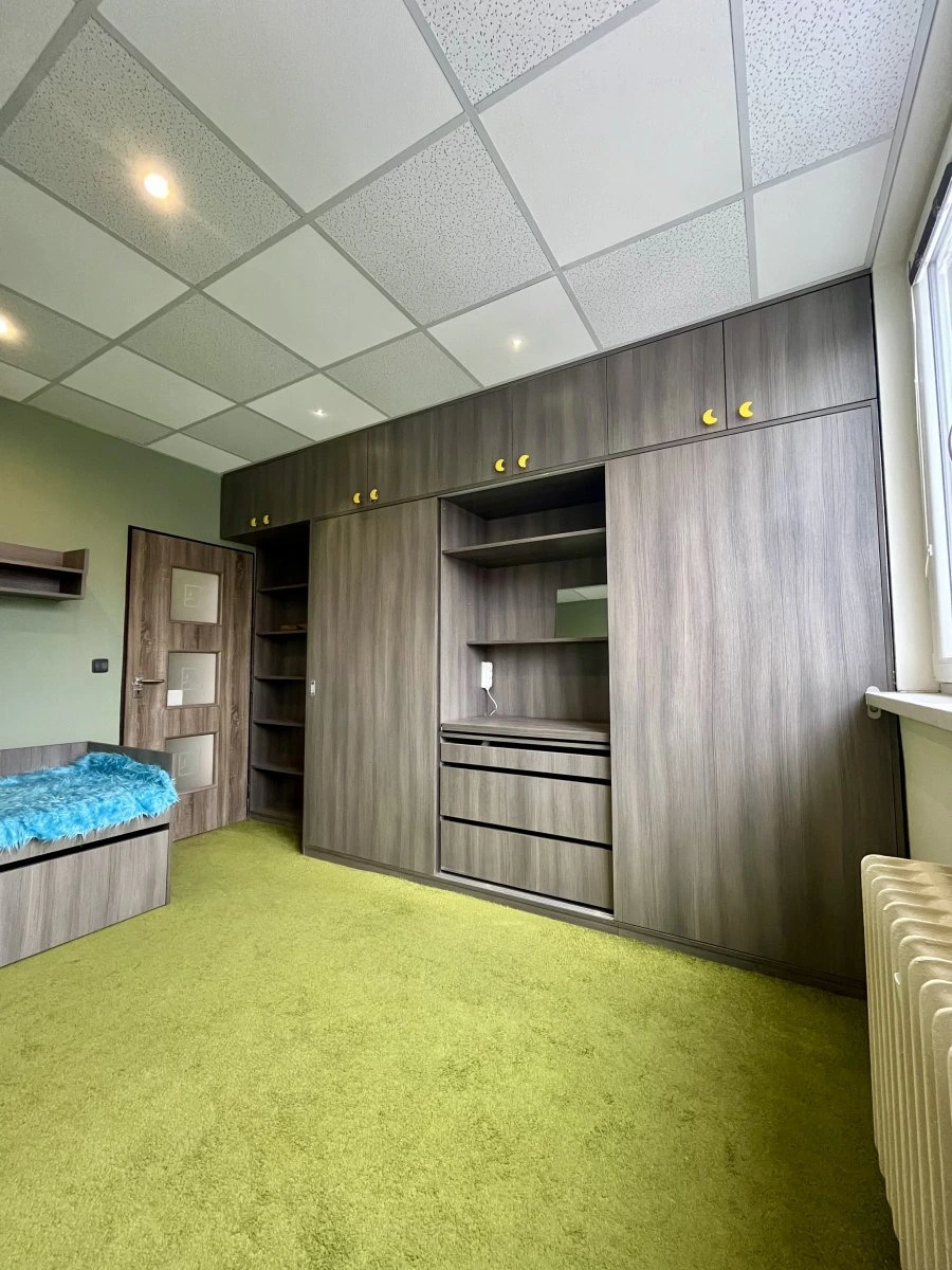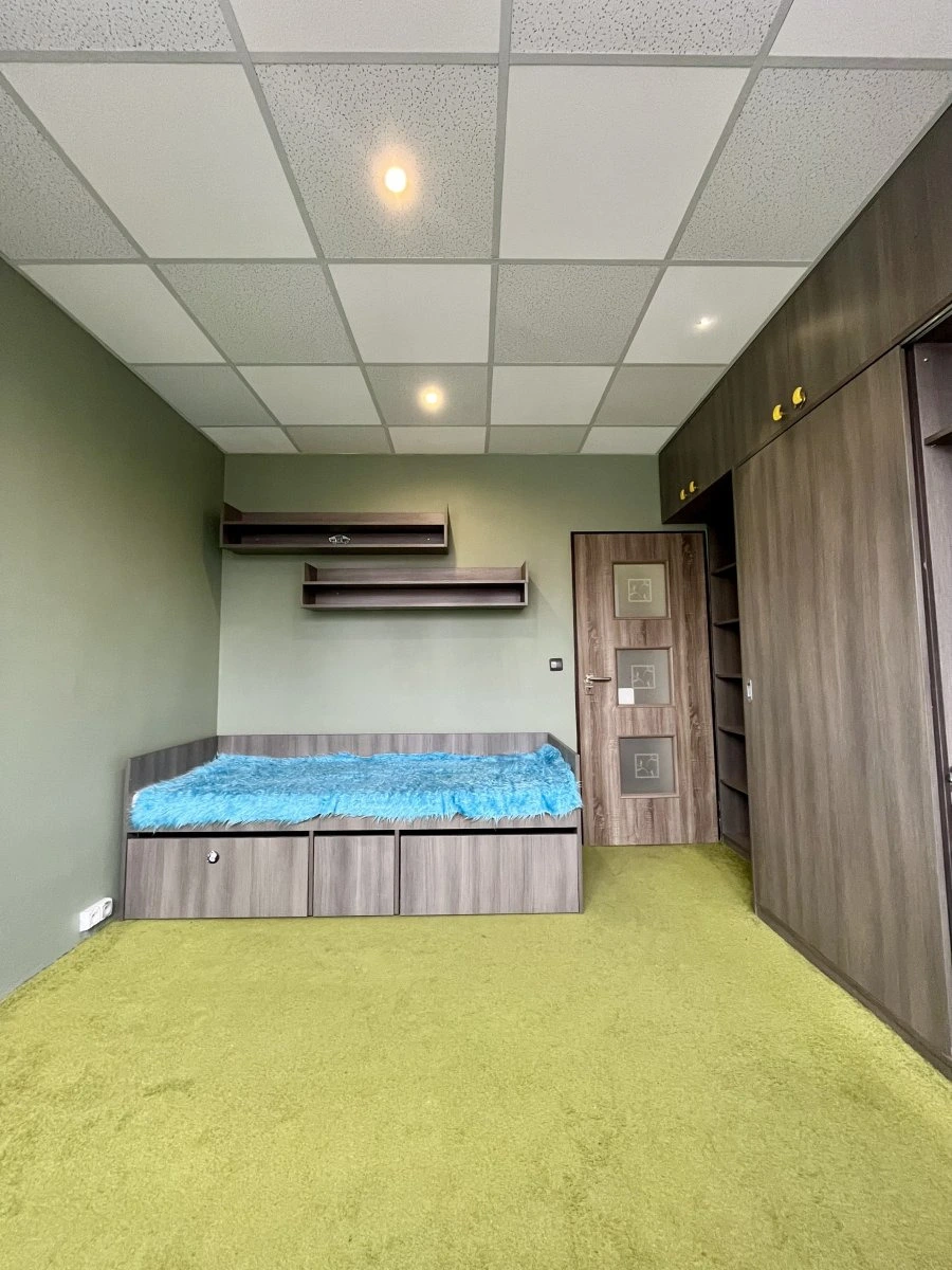 Dispozice bytu zahrnuje dva stejně velké, prostorné a neprůchozí pokoje, z nichž z jednoho je vstup na zasklený balkon. Jeden z pokojů je vybaven vestavnou skříní s postelí.