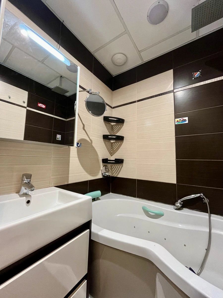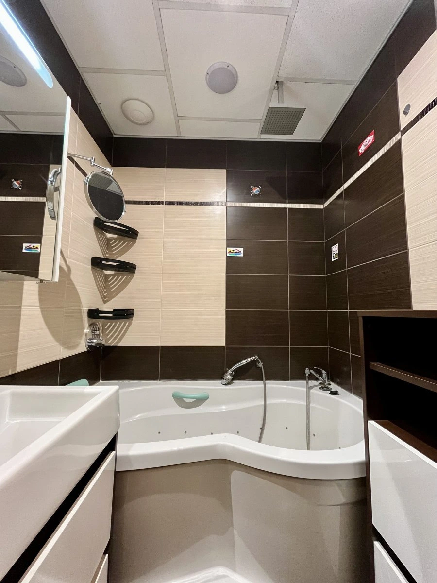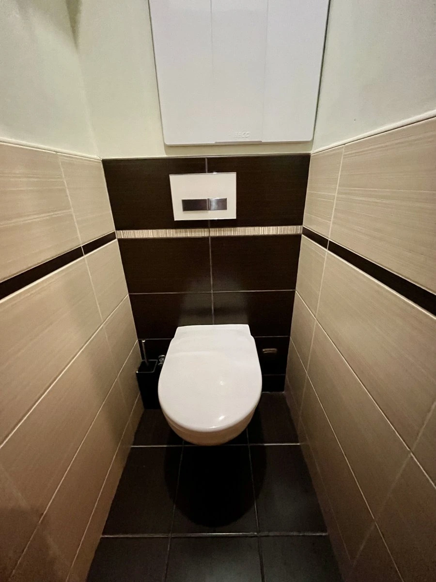 Moderní koupelna disponuje vanou, umyvadlem a koupelnovou skříňkou. Toaleta je samostatná.