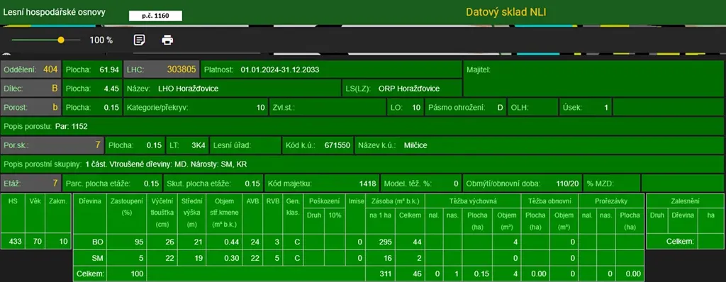 - p.č. 1160 vedená jako lesní pozemek o celkové výměře 1 215 m2 (stáří lesa 72 let - zastoupení dřevin borovice, smrk).